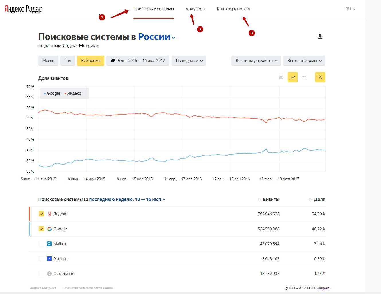 - Динамика поисковиков интересна в плане поискового трафика. Если вы немного или много занимаетесь SEO (search Engine Optimization), то очень рьяно следите за трафиком из Яндекса и Google. А алгоритмы у “монстров поиска” разные. Чисто гипотетически, если один из них набирает популярность, то на него можно переориентироваться и оптимизировать свой продукт должным образом.