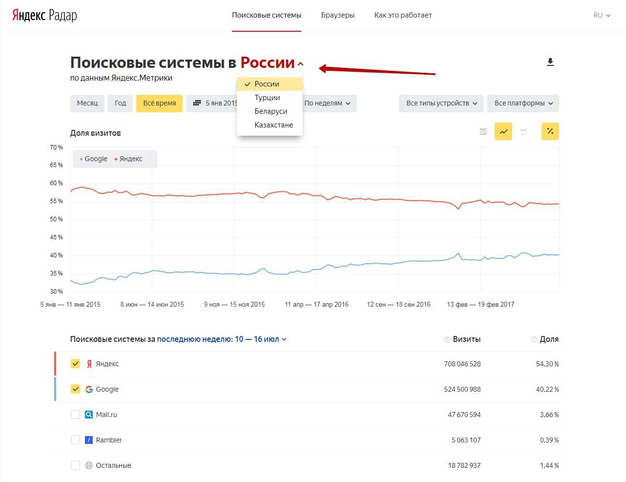 Нажимаем на “Россия” и нам открывается возможность выбрать ГЕО локацию. Сейчас статистика по поисковикам и браузерам доступна только по четырем странам, это: Россия, Турция, Беларусия, Казахстан.