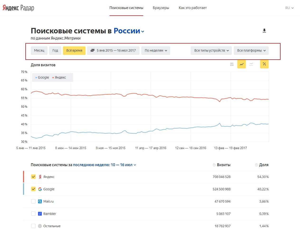 Здесь вы можете выбирать период времени: месяц, год или задать свой определенный на календаре. Дальше доступна детализация по: дням, неделям, месяцам и кварталам. Чуть правее идет выбор устройств и платформ. Настраивая фильтры, вы можете посмотреть как разные браузеры/поисковики развиваются на разных устройствах или платформах.