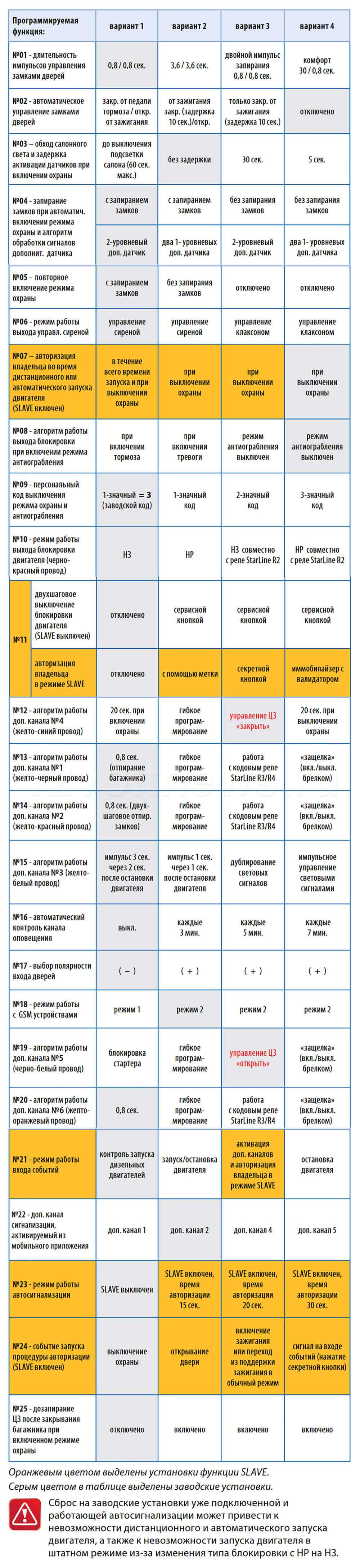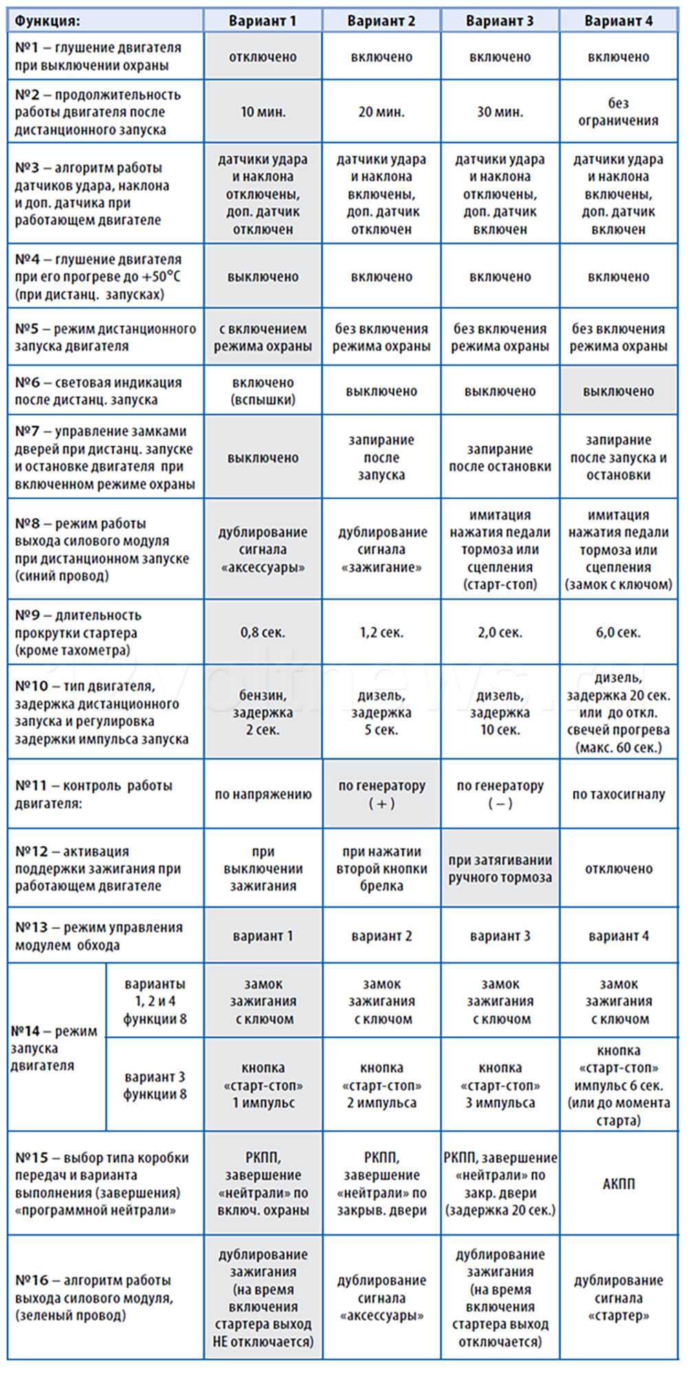 В категории для запуска двигателя предусмотрено 16 функций. Пользователь тоже может выбирать из 4 вариантов состояния. Серым цветом отмечены заводские настройки, с которыми поставляется сигнализация.