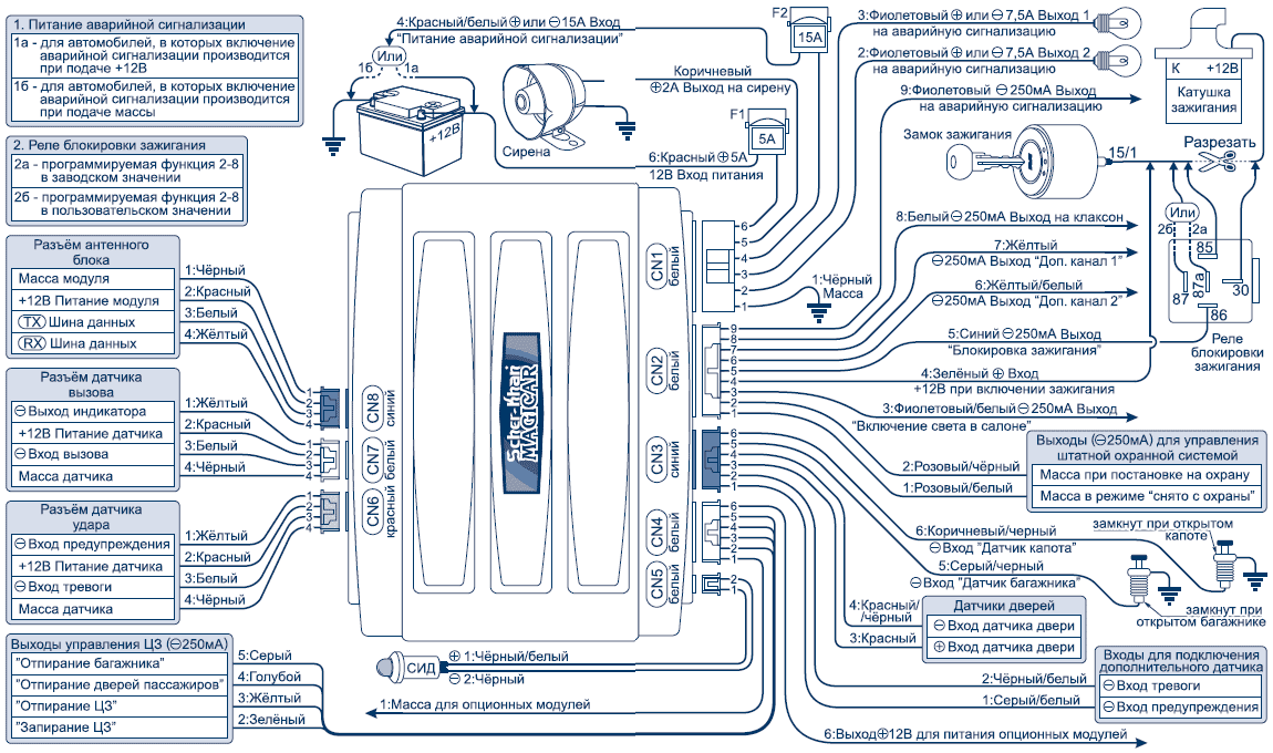 Автосигнализация предназначена для установки на большинство моделей автомобилей отечественного и импортного производства с любыми видами двигателей. Бортовая сеть должна обеспечивать напряжение в 12 вольт. Все электронные блоки устройства устанавливаются в салоне автомобиля, а сирена в моторном отсеке.