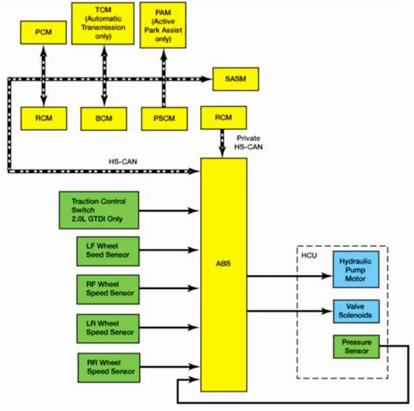Модуль ABS постоянно отслеживает и сравнивает скорость вращения ведущих колес по отношению к неведущим колесам. Когда ведущие колеса начинают вращаться быстрее, чем ведущие колеса, модуль ABS регулирует тормозное давление на соответствующий тормозной суппорт или колесный цилиндр, открывая и закрывая соответствующие соленоидные клапаны внутри HCU во время работы гидравлического насоса. мотор активирован. В то же время модуль ABS вычисляет, насколько необходимо снижение крутящего момента двигателя для устранения пробуксовки колес, и отправляет это сообщение о снижении крутящего момента в PCM по сети высокоскоростного контроллера (HS-CAN). Модуль ABS также отправляет сообщение о событии тяги в BCM по сети высокоскоростного контроллера (HS-CAN), BCM ретранслирует сообщение о событии тяги на IPC по сети контроллера средней скорости (MS-CAN). Когда PCM получает сообщение о снижении крутящего момента, он регулирует синхронизацию двигателя и уменьшает импульсы топливных форсунок, чтобы снизить крутящий момент двигателя до требуемого уровня. Когда IPC получает сообщение о событии тяги, он мигает индикатором устойчивости / противобуксовочной системы (скользящий значок автомобиля). Как только скорость ведомого колеса возвращается к желаемой скорости, модуль ABS возвращает электромагнитные клапаны в HCU в их нормальное положение, отключает двигатель гидравлического насоса и прекращает отправку сообщений о событии тяги и снижении крутящего момента. PCM возвращает синхронизацию двигателя и топливные форсунки в нормальный режим работы, а IPC гасит значок скользящего автомобиля. После того, как скорость автомобиля превышает 100 км / ч (62 миль / ч), контроль тяги осуществляется только через контроль крутящего момента PCM.