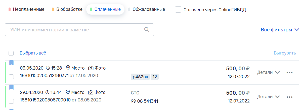Недоплаченные штрафы сервис тоже отображает и позволяет оплатить: