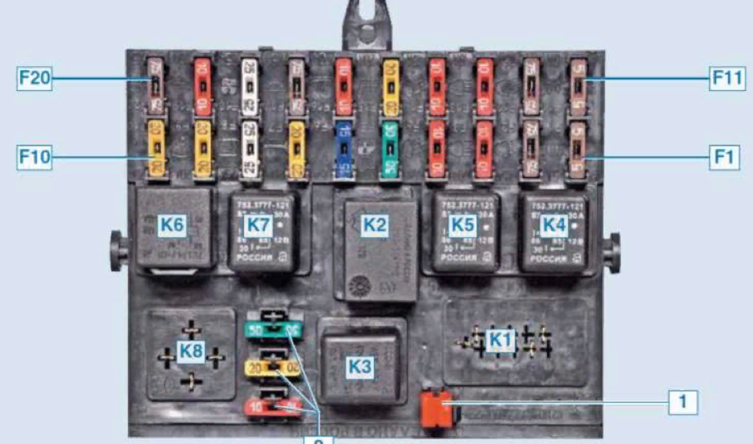 (наружная цифра в обозначении наконечника провода – номер колодки, а внутренняя цифра – условный номер штекера): К1 – реле контроля исправности ламп (внутри показаны контактные перемычки, которые устанавливаются вместо реле); К2 – реле очистителя ветрового стекла; К3 – реле-прерыватель указателей поворота и аварийной сигнализации; К4 – реле включения ближнего света фар; К5 – реле включения дальнего света фар; К6 – дополнительное реле; К7 – реле включения обогрева заднего стекла; F1–F20 – плавкие предохранители.