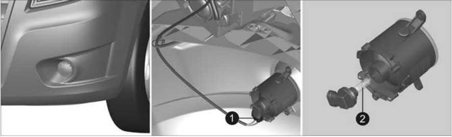 - ближнего/дальнего света 3: снимите крышку 2 с гнезда заменяемой лампы и соединительную колодку 4, затем нажмите на рычаг пружины вниз для выведения ее из зацепов на рефлекторе и извлеките лампу;