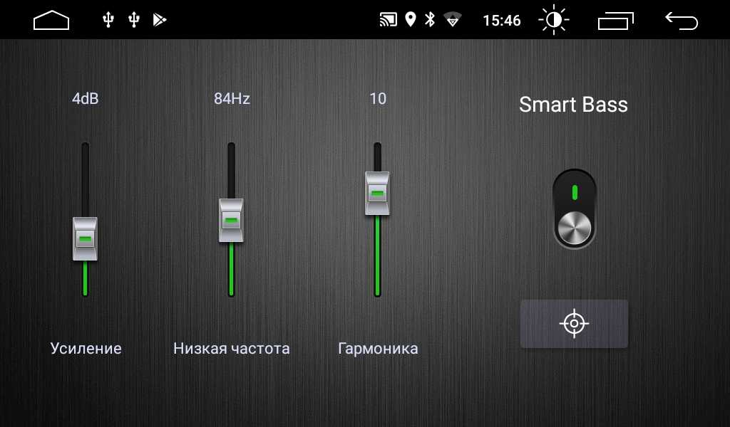 Тонкая настройка баса. По сути, басовый параметрический эквалайзер. Выберите центральную частоту и коэффициент её усиления. Добавьте баса там, где это необходимо. Функция «Гармоника» автоматически восстанавливает гармоники низких частот, потерянные при сжатии аудиофайлов. Вы поймете это, сравнив звучание DTA магнитолы с обычным автомобильным ресивером, на заводских («нулевых») аудио настройках.