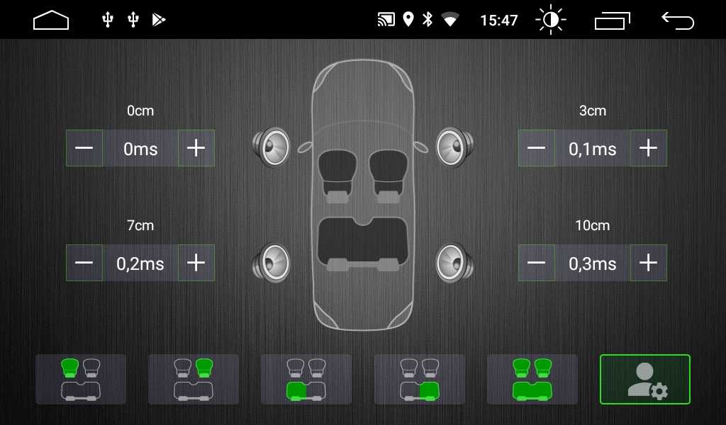Учитывая, что водитель сидит в передней части машины, настройка эквалайзера автомагнитолы должна быть проведена так, чтобы задние колонки работали с небольшой задержкой.