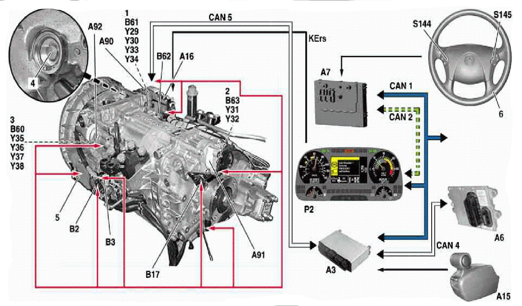 2) Драйвер определяет его требование переключения передач с помощью программы «Электронный выбор» и блок управления ПРА (GS) (A16) автоматически выбирает оптимальное соединение передачи