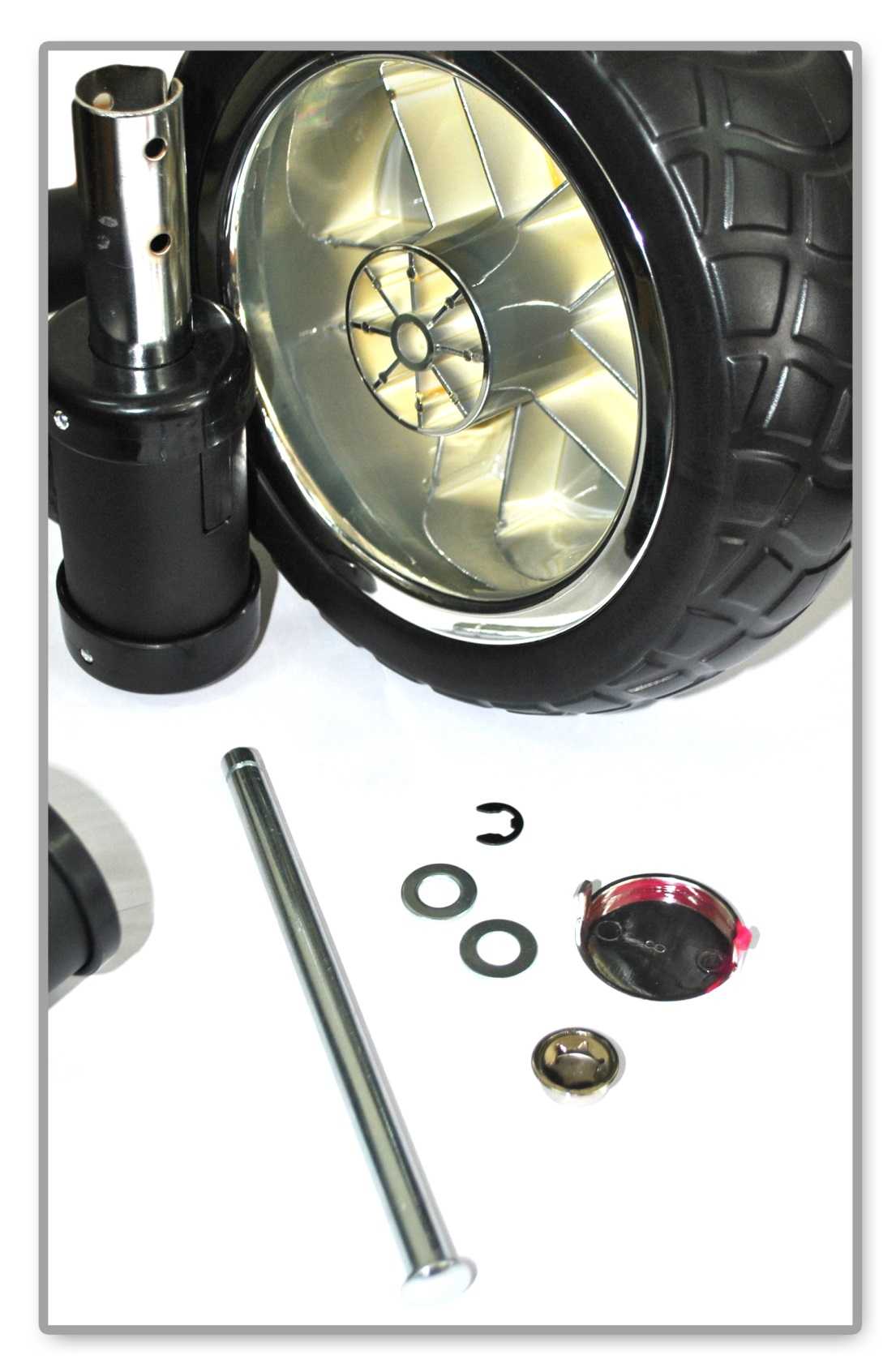 Покрышки выполнены из прочной резины. Подкачивать их не нужно. Обод хромированный. Спереди установлено колесо диаметром 25 см, сзади – 21 см.