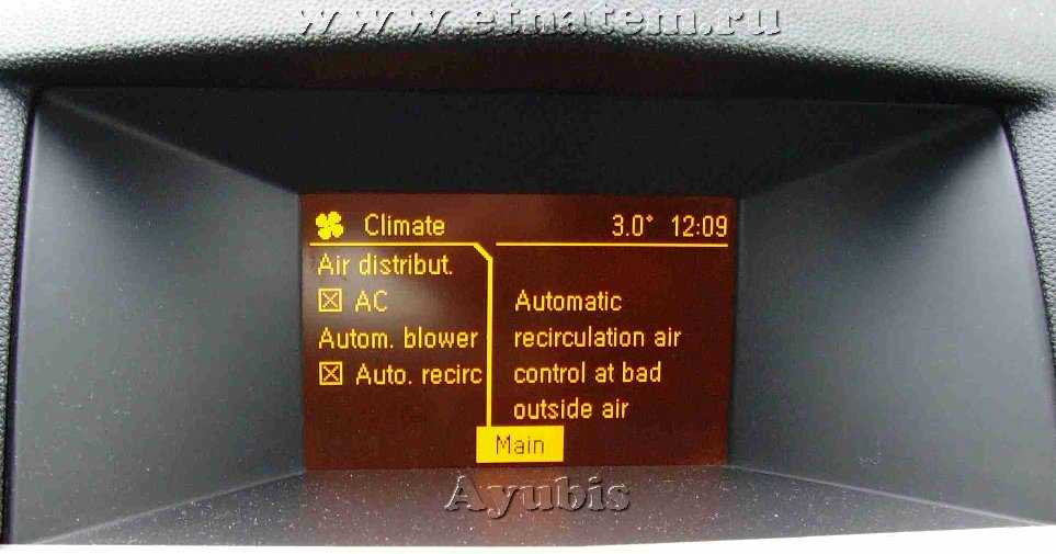 Здравствуйте! Электронная система климат-контроля обеспечивает максимальный комфорт в салоне автомобиля при всякой погоде, при любой наружной температуре, в любое время года. Чтобы обеспечить постоянный и уютный климат в автомобиле, производится автоматическая регулировка температуры поступающего воздуха, а также расхода и распределения воздуха в зависимости от наружных атмосферных условий.Возможна установка режима вручную, например, режим без охлаждения и распределения воздуха, с помощью меню на дисплее. При включенном охлаждении (компрессор кондиционера) производится охлаждение и осушение воздуха.Настройка режима обдува вручную;
