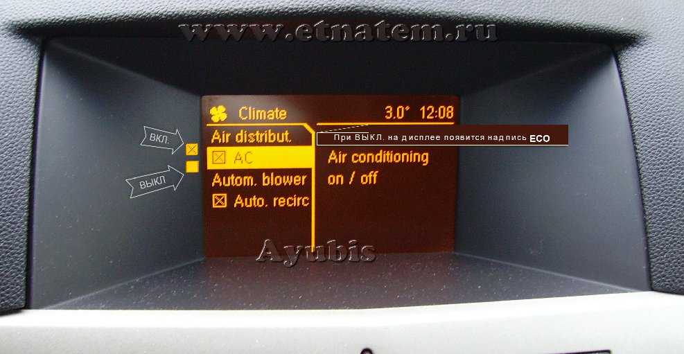 Кондиционер может не работать на остывание, если включен компрессор и на экране пылает надпись Eco. соль попадая на цветной металл мы видим утечку из кондиционер | как это. При включенном компрессоре воздух не охлаждается, а просто подается в салон. Чтобы отключить компрессор необходимо зайти в меню климат-контроля, нажав ручку регулировки воздушных потоков. Как включить кондиционер в опель корса | vavto.net. как снять ручку стеклоподъёмника задней двери? Астра н, опель астра 2010 года:. Избрать пункт «АС» и снять с него крестик (нажатием той же ручки). Для включения – поставьте в пт «АС» крестик.