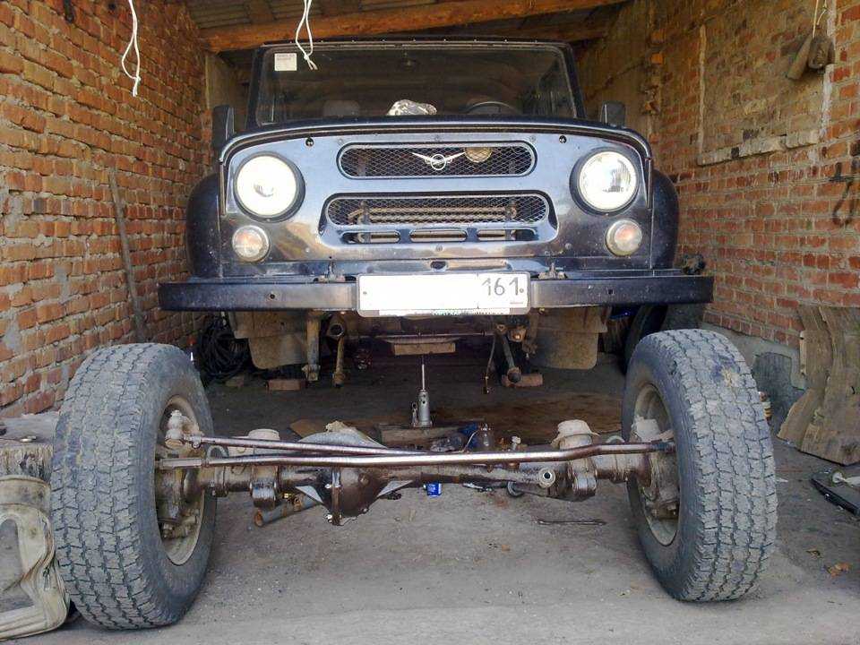 Сначала нужно снять передний мост, для чего следует подставить кирпичи или колодки под задние колеса машины, чтобы работать было удобнее. Затем снимаем трубопроводы, они крепятся на гибком шланге, уходя к тормозным устройствам. Откручиваем все гайки, крепящие амортизаторы, а также болты, соединяющие ведущую шестерню с карданным валом. Отсоединяем тягу от сошки, снимаем стремянки, накладки и прокладки.