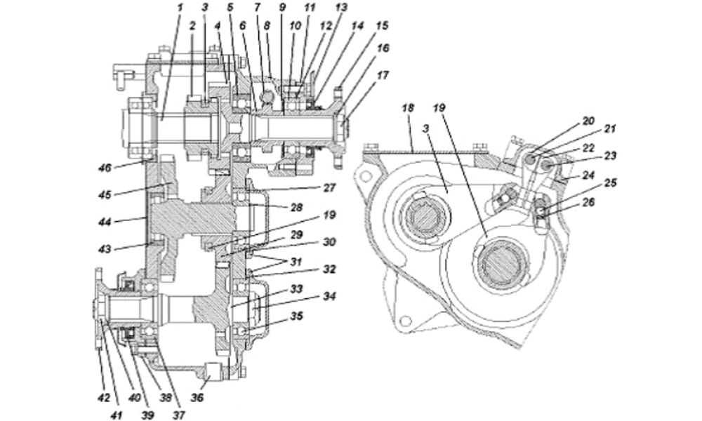 Вал привода переднего моста 33 (рис. 1) передает крутящий момент на передний карданный вал и изготовлен за одно целое с ведомой шестерней. Вал установлен на двух подшипниках и фиксируется специальной гайкой, которая стопорится вдавливанием ее буртика в паз вала.
