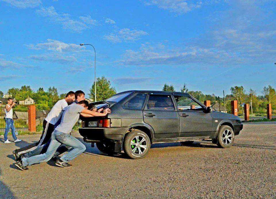 Толкать автомобиль с инжекторным движком лучше несколькими парами рук. Однако и мешать друг другу не нужно — идеальный вариант 4–5 человека. Двое спереди, трое сзади.