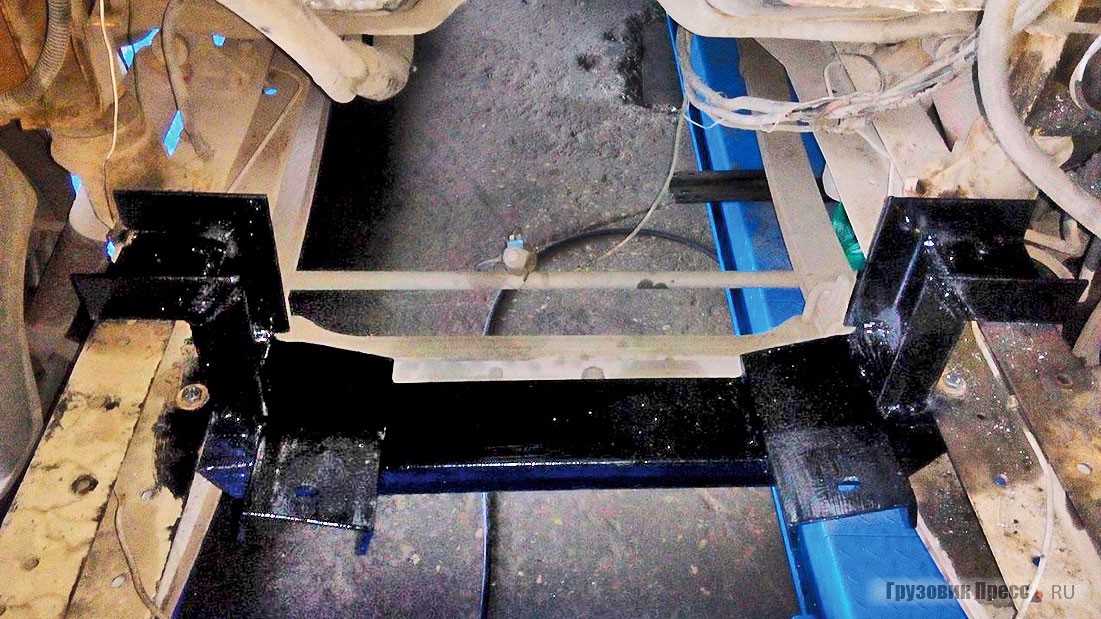 Следующим шагом, открутил подушки двигателя от лап и установил за балкой ромбический домкрат, после чего немного приподнял двигатель. Открутил болты крепления верхних рычагов с каждой стороны и вытащил с рамы пластины гайки. Далее, открутил четыре болта снизу и снял балку в сборе. Оттянул ее в сторону и приступил к установке балки с шарами.
