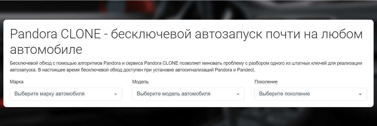 Pandora CLONE поддерживается для большинства автомобилей, присутствующих на российском рынке, однако есть и модели, для которых эта функция недоступна. Чтобы узнать, сможете ли вы сохранить все ключи при подключении запуска, воспользуйтесь нашим сервисом https://www.pandora-alarm.ru/clone/. Достаточно просто указать марку, модель и модификацию своего авто, чтобы система показала интересующую вас информацию.