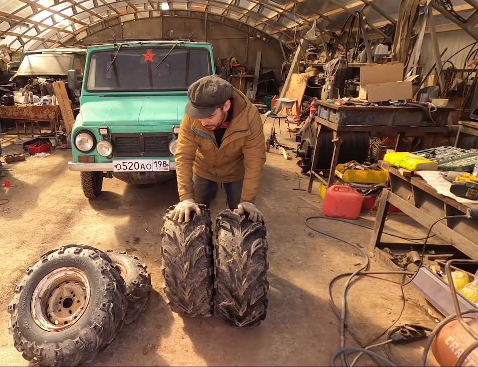 Прежде всего, колёса. Хоть и стоковая резина на подопытном ЛуАЗике выглядит не такой уж и безобидной, но всё познается в сравнении. И когда ребята показали комплект колёс, всё стало ясно. Если ставить, то только такие. При этом, не смотря на различие в размерах, колёса подошли!