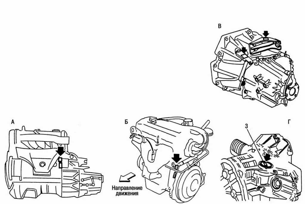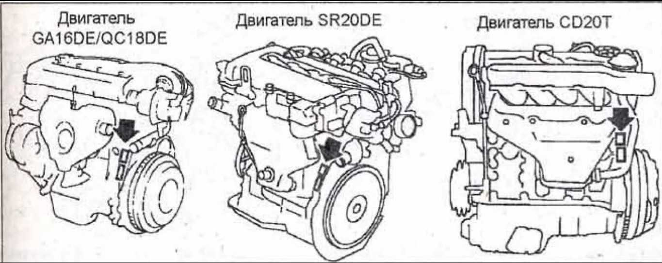 Расположение номера двигателя на Nissan: А — номер бензинового двигателя, Б — номер дизельного двигателя, В — номер МКПП, 1 — табличка, 2 — номер на щитке