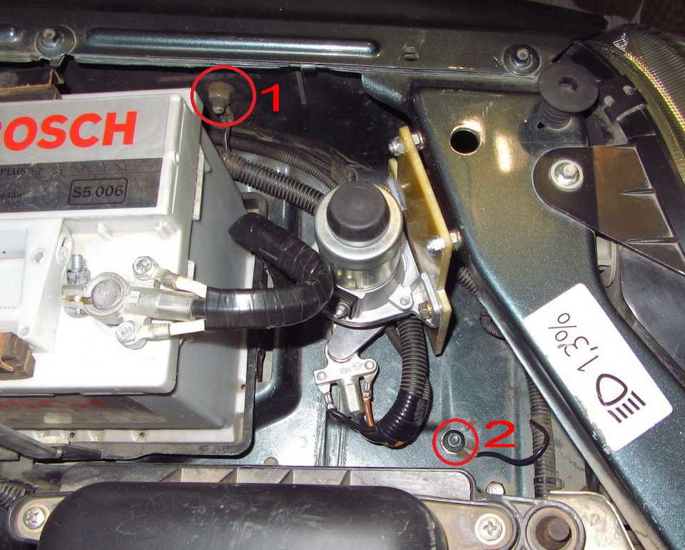 1. Шпилька на левом брызговике, за аккумуляторной батареей.С минусовой клеммы АКБ2. Шпилька на левом брызговике, у фары.