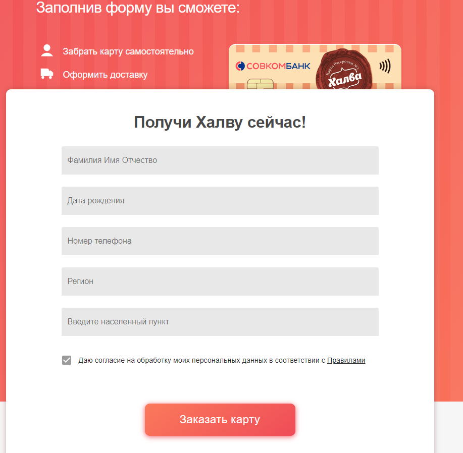 В первую очередь нужно подать онлайн-заявку на получение кредитной карты от Совкомбанка: