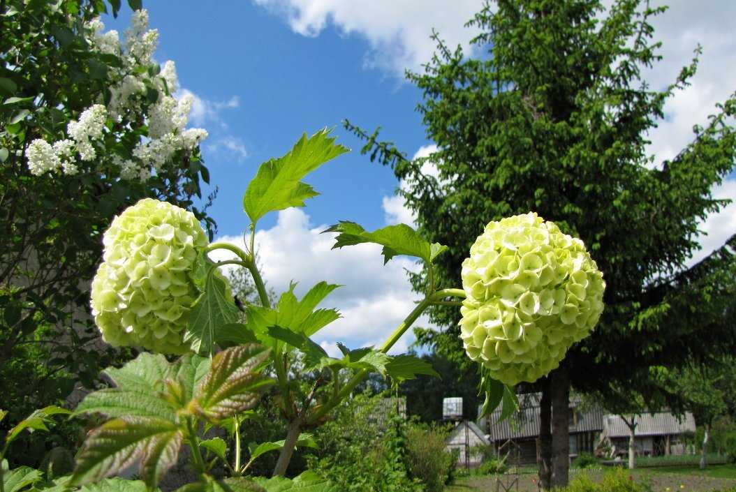 Для защиты от муравьёв и тли, которую они же и выращивают на кустарнике, калину садят рядом с хвойными деревьями. С таким соседством многие вредители и болезни отступят, а соцветия станут крупнее. Лучшая благодарность за все старания — цветущая иллюзия снегопада.