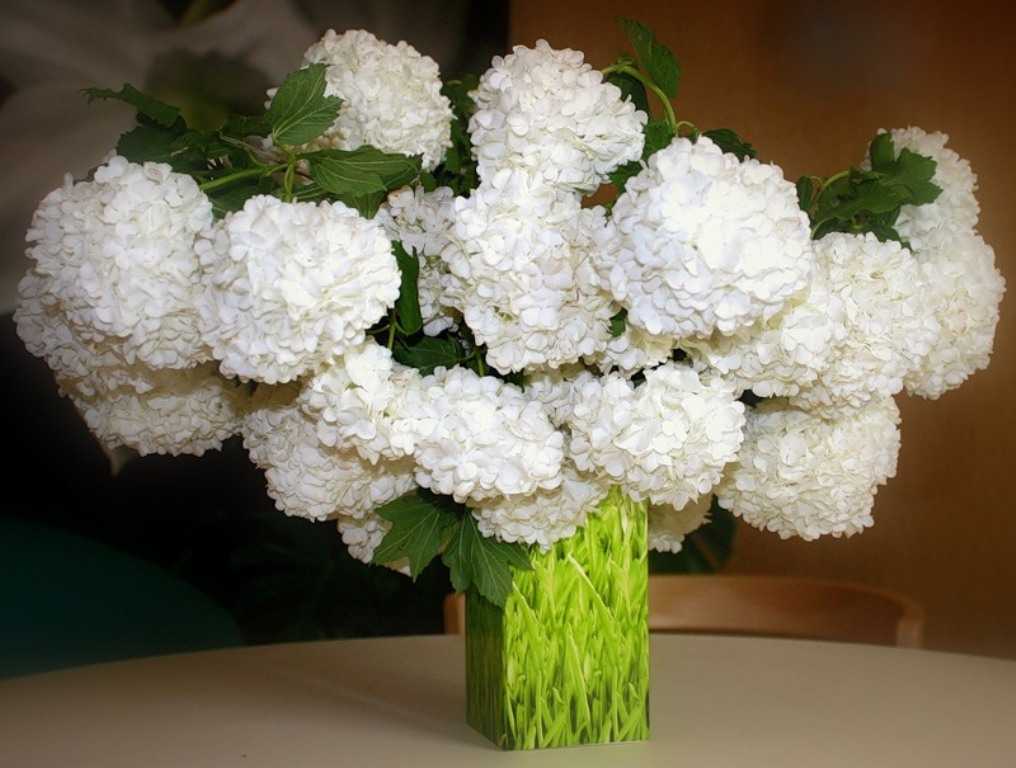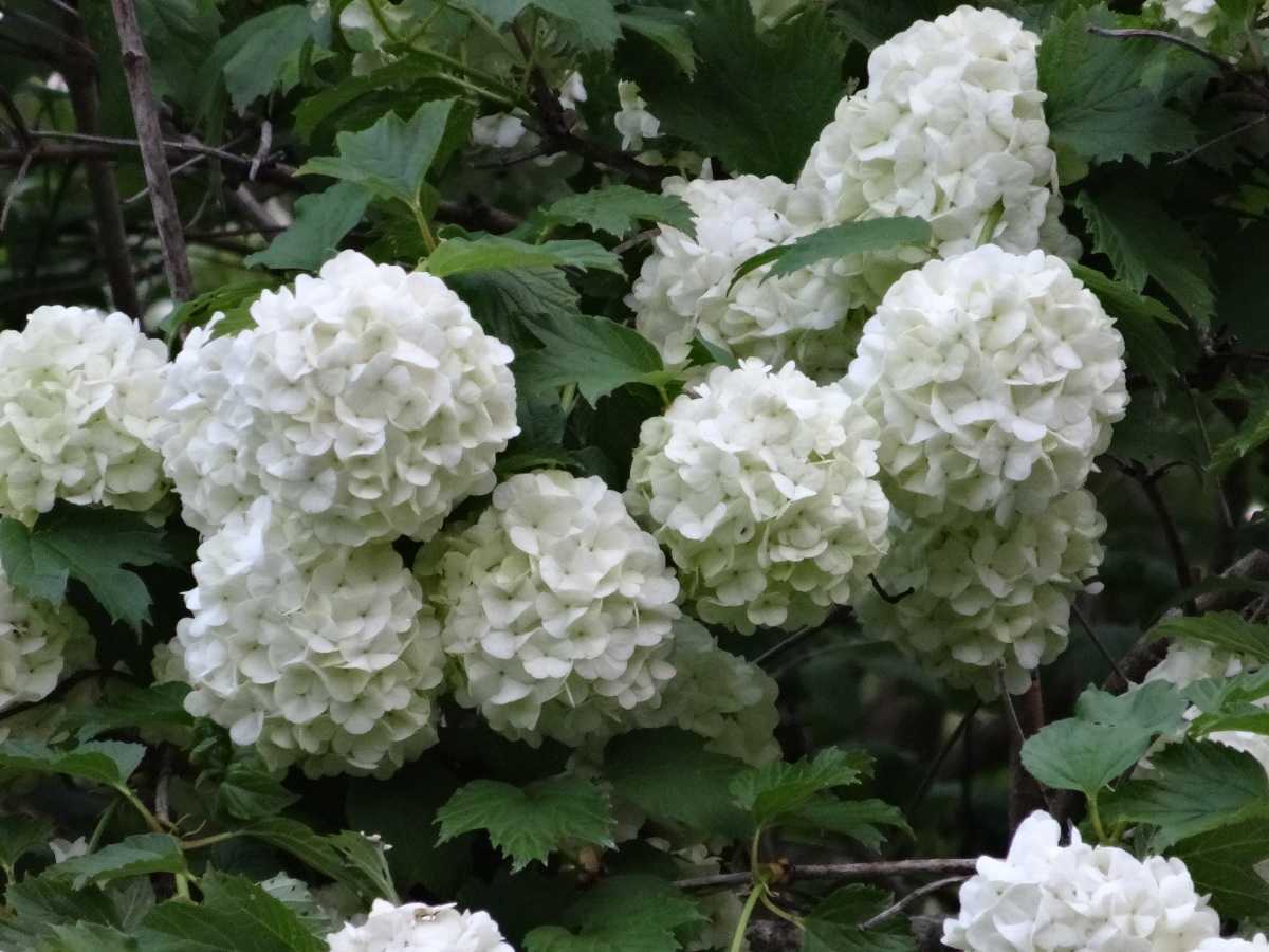 Когда зацветает декоративный кустарник, а это происходит в конце мая, вспоминается снежная зима. Крупные соцветия, имеющие форму шара и напоминающие комья снега, облепляют ветки так густо, что уместно сравнение растения с заснеженным. В диаметре они достигают 20 см. Раскрывшиеся, только начавшие цветение цветки имеют зеленоватый цвет, но меняют его на ослепительно белый и становятся похожими на снег.