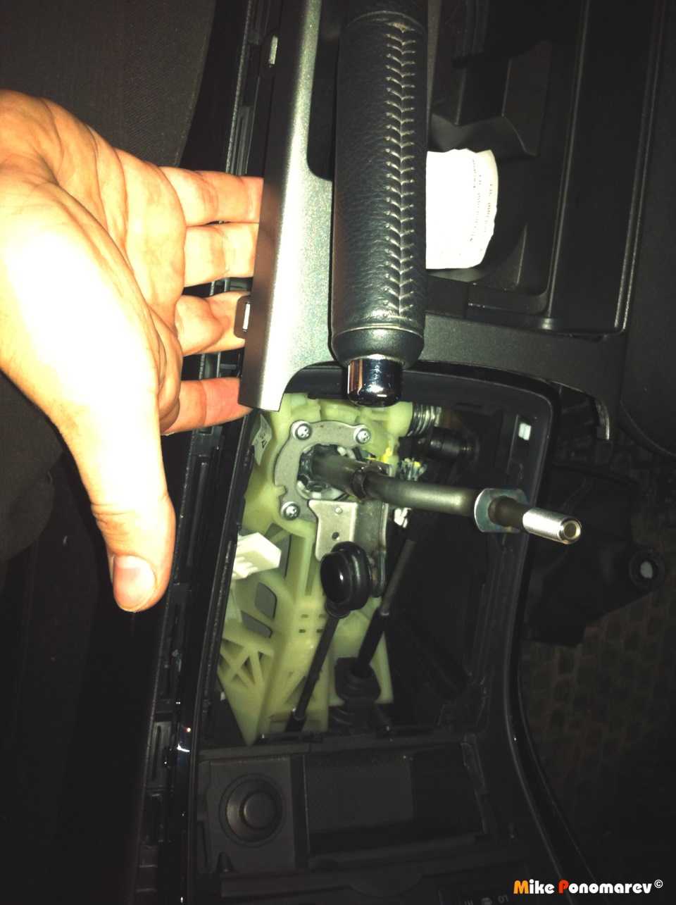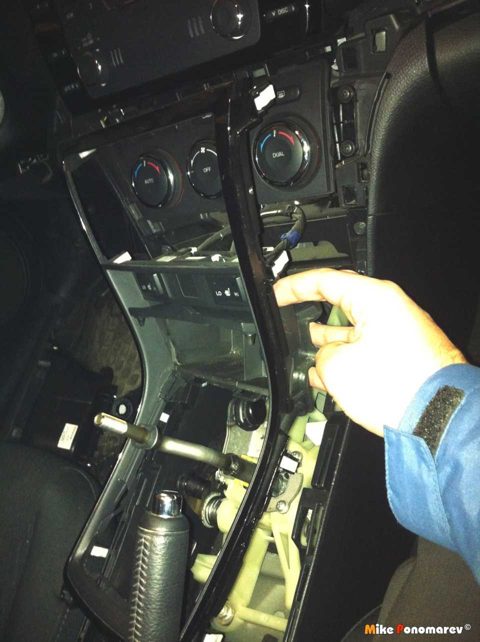 Для начала снимаем декоративную панель под бардачком и ещё одну справа от руля, а также поддеваем панельку на которой закреплен кожух КПП: