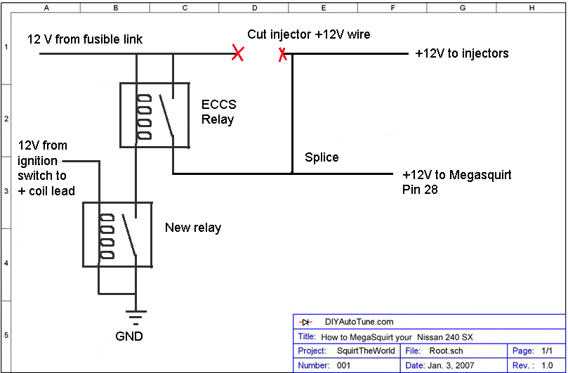 The stock Nissan ECCS relay is grounded through a circuit in the ECU. Also, the stock S13 wiring harness is set up to send the injectors 12 volts at all times, even when the ignition is turned off. When converting to Megasquirt, the injectors must not have 12 volt power unless the Megasquirt is also powered up. Sending the injectors 12 volt power with the Megasquirt ECU off can result in damage to the flyback circuits. The wiring diagram below shows one way of modifying the stock wiring so that the ECU and injectors power up at the same time, and also allows the other components drawing power from the ECCS relay to work as normal. Note: The MSPNP uses different injector drivers that shut off on key-off, and has its own circuit for controlling the ECCS relay. These notes on the ECCS relay only apply to traditional MegaSquirts. It does not apply to the MSPNP.