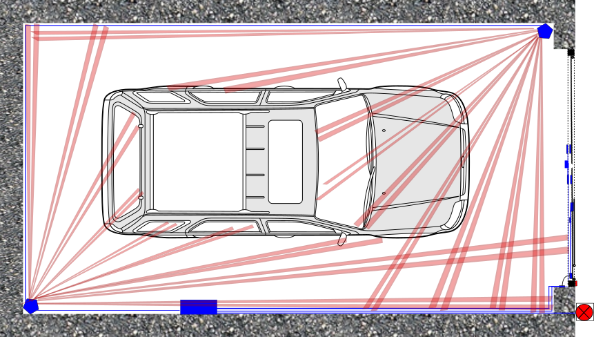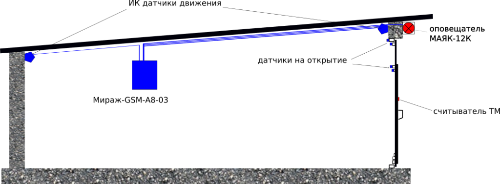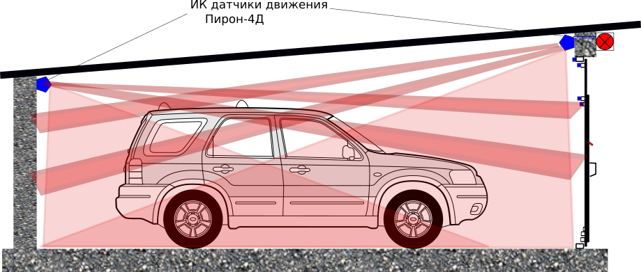ИК датчики движения имеют угол обзора 90 градусов, поэтому их лучше разместить в углах гаража. Монтировать датчики (согласно инструкции на датчик) положено на высоте 2,3м. В виду того, что гаражи как правило не высокие, установите ИК датчики как можно выше. Датчики должны «обхватывать» весь объём гаража как показано на рисунке.Возможно для этого датчик придётся слегка направить вверх, например с помощью кронштейна. ИК датчики нужно использовать с защитой от животных, если могут появиться грызуны. Есть особенность применения сигнализации зимой, если в холодный не отапливаемый гараж Вы въехали на автомобиле с горячим двигателем. Воздушный конвекционный поток от горячего капота автомобиля может вызывать ложное срабатывание ИК датчиков, поэтому для надёжной постановки под охрану дождитесь охлаждения двигателя, поставив на охрану позже командой с телефона (в крайнем случае можно заклеить сектора линзы датчика «смотрящие» над капотом клейкой бумагой).