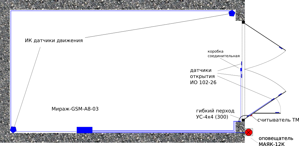 Оповещатель светозвуковой (на рисунке Маяк-12К) монтируем на фасаде как можно выше. Световой сигнал зависит от охранного режима прибора (горит — в режиме «охрана», мигает — в режиме «тревога»), звуковой сигнал включается в режиме тревога. Кабель соединяющий Маяк-12К с прибором лучше пропустить за ним через отверстие в стене.