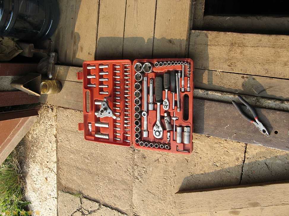 Лучше всего иметь комплексный набор инструментов. Если его нет, понадобятся ключ-трещотка с головкой 10 и ключ на 16, удлинители, шестигранные отворотки, герметик.
