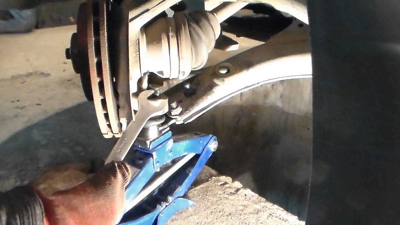 После проверки крепежей переходим к осмотру шаровых соединений правого рычага. Идентичную операцию необходимо провести и с противоположной стороны.