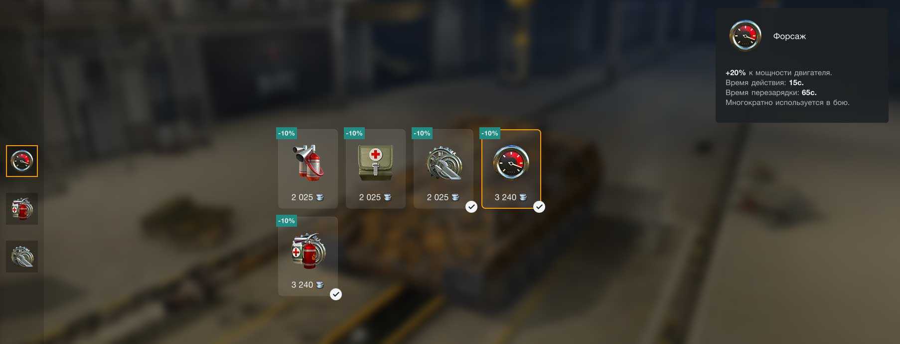- 2-я строка: Усиленные приводы наводки, Усиленная броня, Подкрученные обороты двигателя