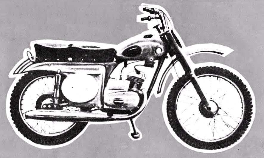 Рис. Минск М-205 для кроссов. Двигатель 125 см3, 8 л.с. Вес 85 кг. Дорожный просвет — 135 мм.