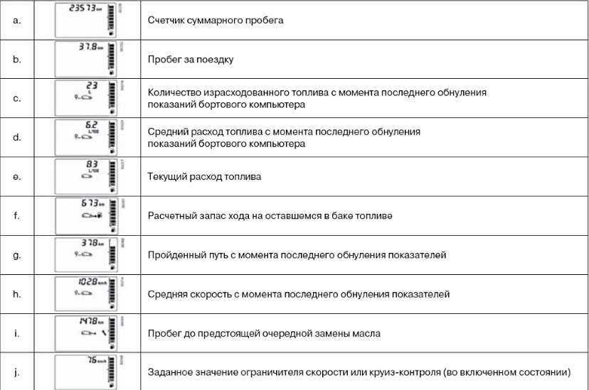 Для сброса показаний необходимо выбрать нужный пункт в меню и держать кнопку нажатой несколько секунд. Для сброса пробега до следующего ТО удерживать кнопку придется около 10 секунд. Схематично весь функционал бортового вычислительного комплекса представлен в таблице ниже.