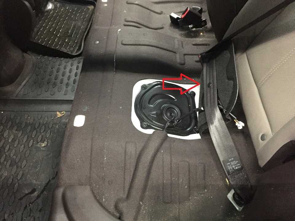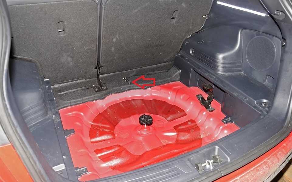 3. Слева по ходу автомобиля есть лючок. Поднимите обивку лючка и зафиксируйте её ремнем безопасности, чтобы она не мешалась.