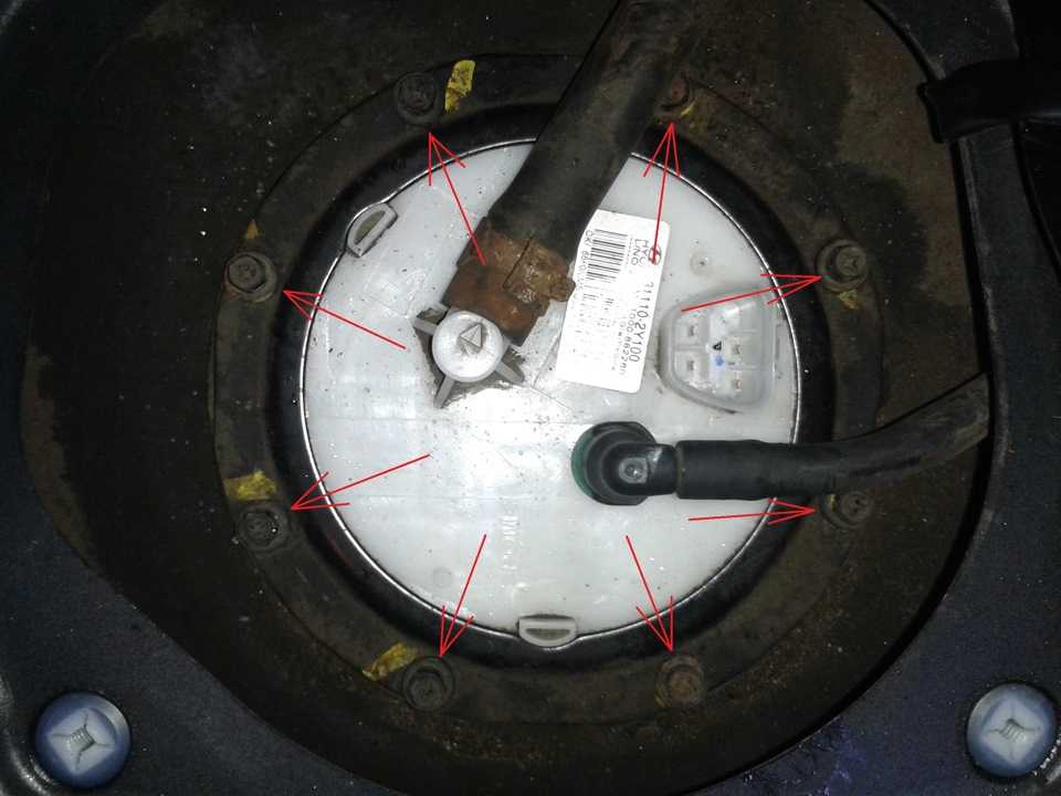 8. Ключом «на 8» или (крестовой отверткой) открутите восемь болтов крепления прижимной пластины крышки модуля, снимите пластину и снимите топливный модуль.