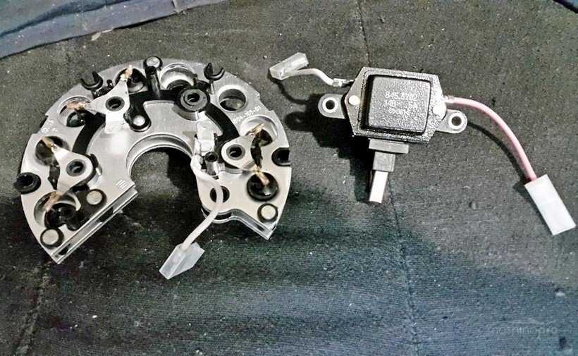- Неисправности выпрямительного блока. Он состоит из нескольких электронных компонентов, образующих диодный мост. При выходе из строя хотя бы одного из них, ток перестает выпрямляться, функционирование регулятора напряжения прекращается: бортовая сеть начинает питаться только от аккумулятора, ресурс работы которого ограничен.