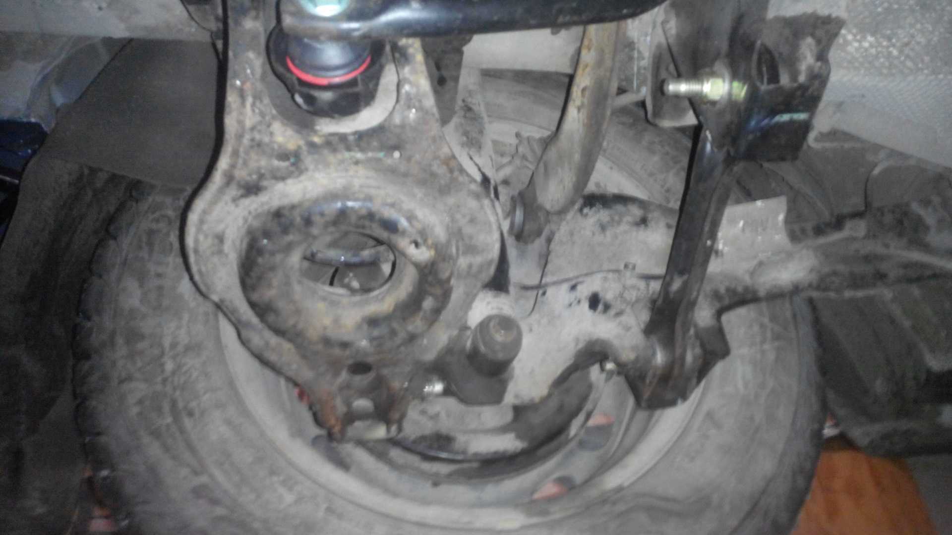 Вид на резьбовую втулку одной из стоек, а также на резиновый пыльник её шарового механизма. Печальное зрелище: