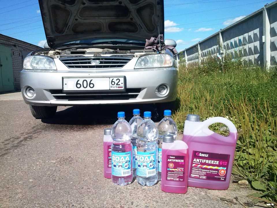 После промывки, наша система полностью готова для нового антифриза. Для залива лучше использовать не готовую жидкость, а концентрат. Это обусловлено тем, что в системе охлаждения Киа Спектра остается часть дистиллированной воды. При использовании концентрата, мы можем его развести, учитывая этот остаток.