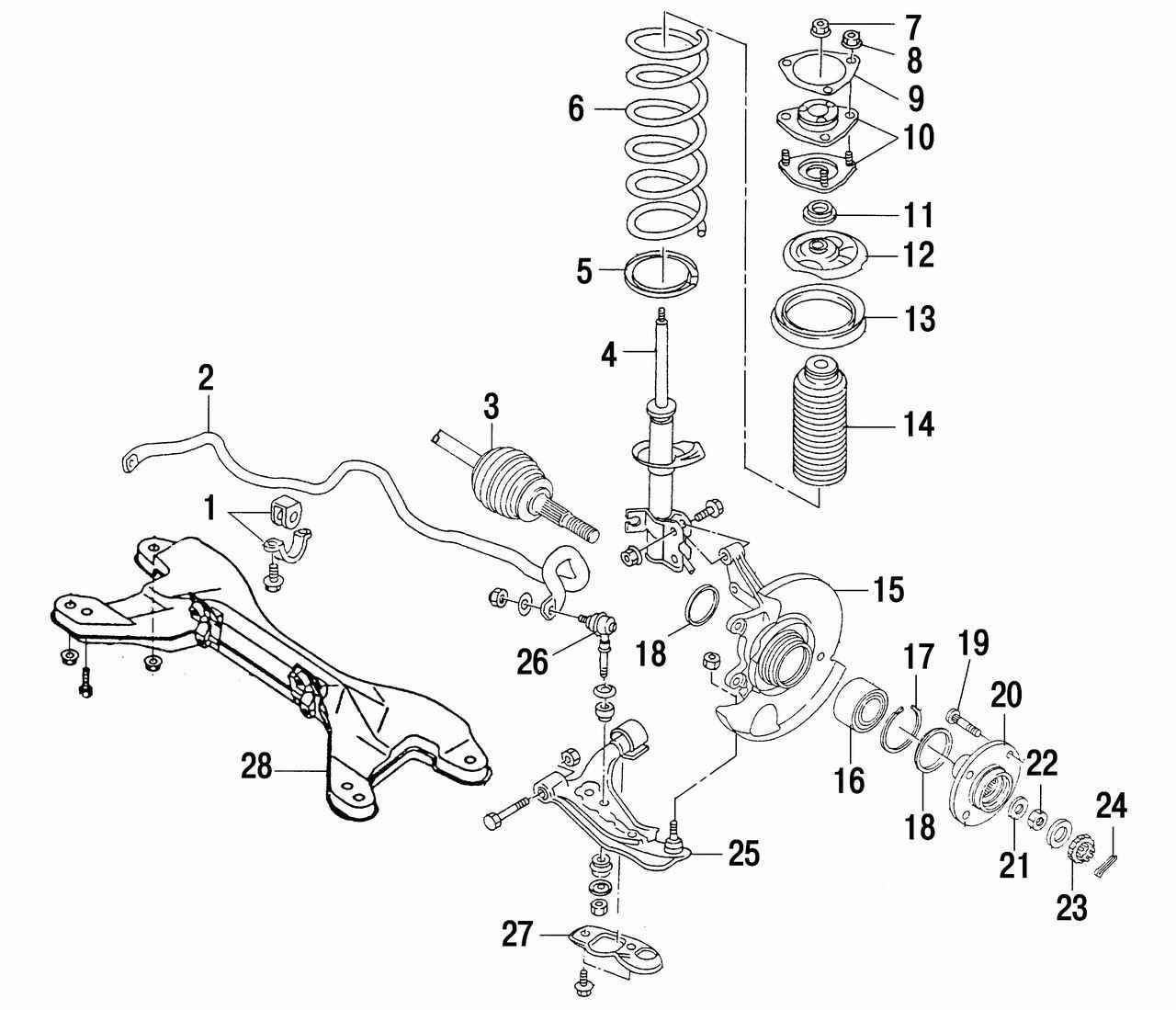 22 — гайка крепления ступицы; 23 — контргайка; 24 — шплинт; 25 — рычаг подвески; 26 — стойка стабилизатора поперечной устойчивости; 27 — задняя опора крепления рычага подвески; 28 — поперечина передней подвески
