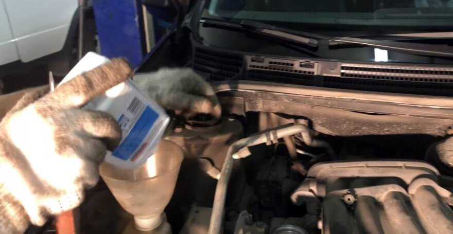 после замены антифриза его состояние вновь проверяют. Если уровень упал — доливают необходимое количество. Если цвет изменился на коричневый или обесцветился — полностью меняют охлаждающую жидкость.