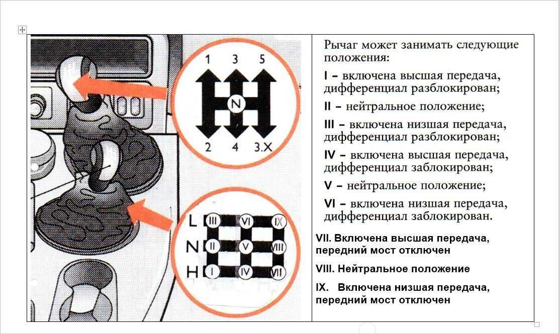 - Рычаг раздатки до упора назад — полный привод, блокировка выключена.