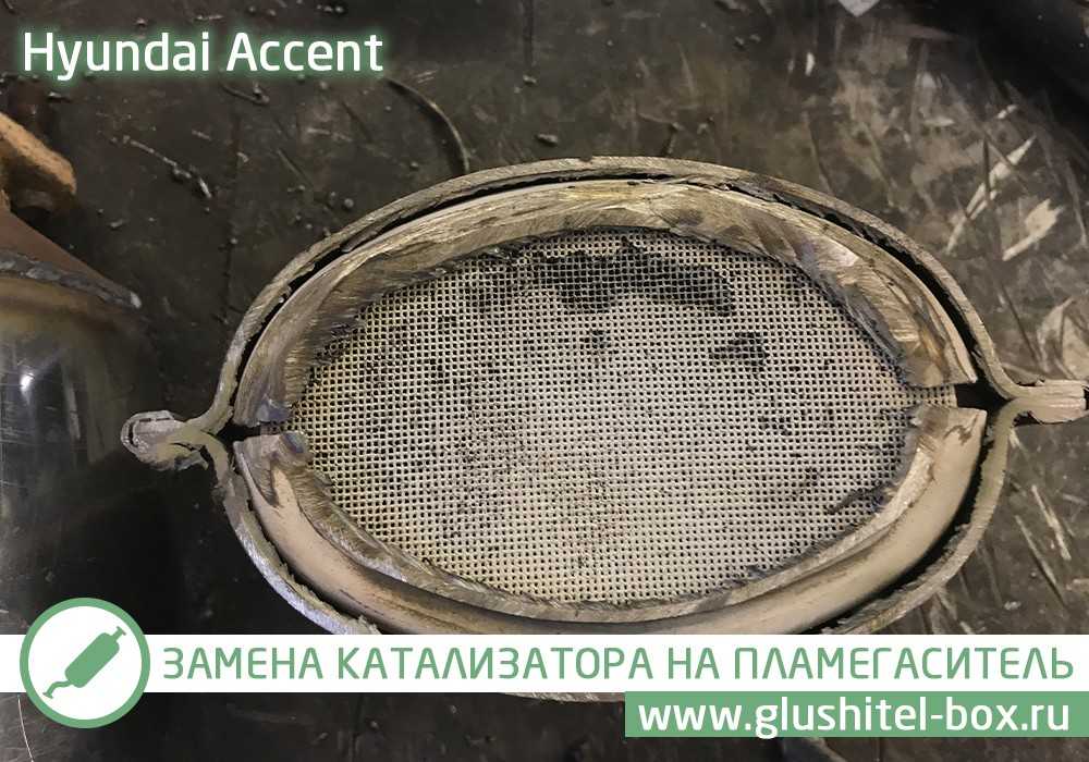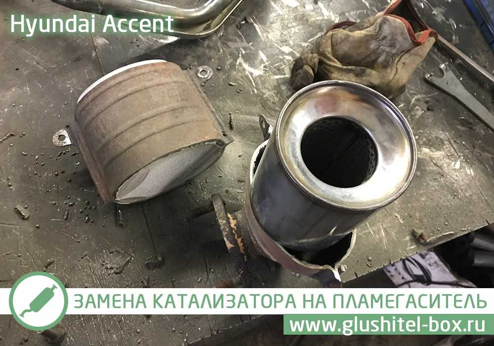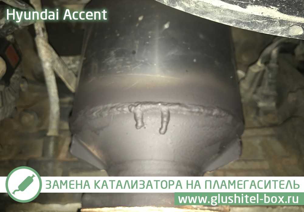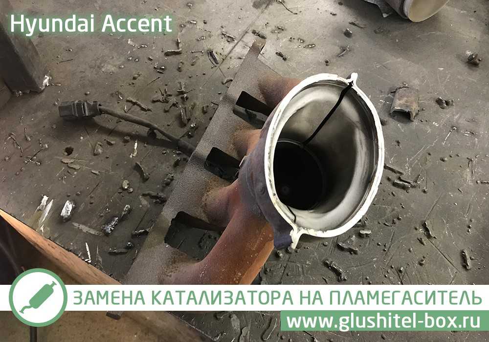 Сегодня расскажем вам о типичной работе по замене катализатора на пламегаситель у автомобиля Hyundai Accent. А/м с бензиновым двигателем объемом 1.5 литра, мощностью 102 л.с.