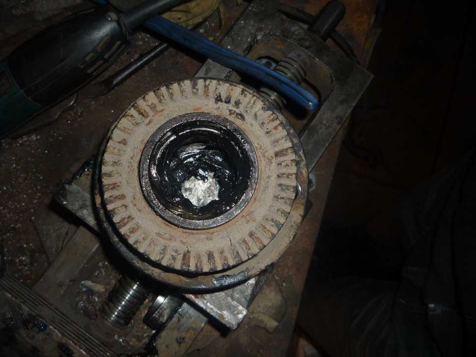 С момента покупки машины в заднюю подвеску не лазил, поменял только тормоза и перебрал суппорта.Краска за 2 года облезла.Вообщем поменять подшипник не так уж и просто.Переломал кучу инструмента))) и смех и грех.Началось с поломки насадки при откручивании болта шруса.Потом сломал насадку на 14., решил сорвать другим болтом на 14…не получилось.И только когда приварил к болту большой рычаг, болт щёлкнул и открутился руками.Дальше ещё интереснее.Чем только я не пытался выпрессовать подшипник.В тиски зажимал, сьёмником пытался, даже кувалду с деревянной ручкой сломал)))).Дальше в ход пошла крупная артилерия)))Взял тяжёлую метровую металическу кувалду, тоже не помогло …Мне это очень надоело, и начал долбить со всей дури.И вот смотрю подшипник стронулся, так и долбил пока весь не вышел.Наружняя обойма приржавела за 23 года к ступице.Да и сами шарики все в ржавчине, …капец вобщем.Впрессовка как обычно, сначала запрессовал в кулак, а потом в подшипник саму ступицу.