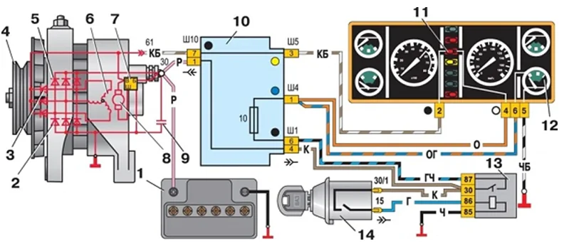 Схема работы АКБ: 1. АКБ, 2. Диод минусовый, 3. Диод дополнительный, 4. Генератор, 5. Диод плюсовой, 6. Статорная обмотка, 7. Регулятор, 8. Роторная обмотка, 9. Конденсатор, 10. Блок монтажный, 11. Лампочка контроля, 12. Вольтметр, 13. Реле зажигания, 14. Замок.
