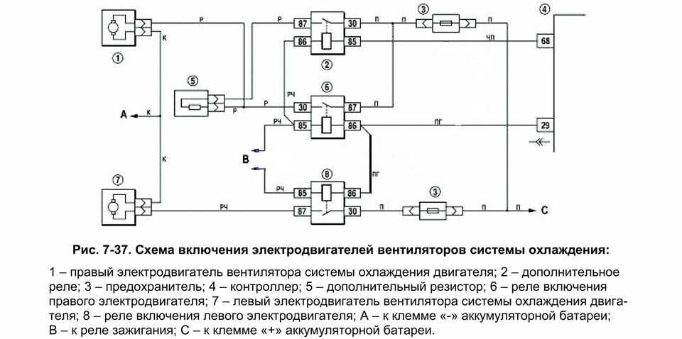 Система питания вентиляторов включает три реле и резистор, который при необходимости обеспечивает пониженную скорость вращения первого мотора. Питание подается от аккумулятора через предохранители, которые спасают проводку и АКБ в случае короткого замыкания. Управляющие сигналы поступают с 29 и 68 вывода контроллера двигателя.