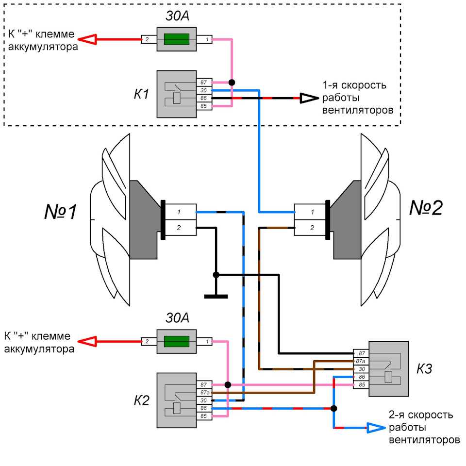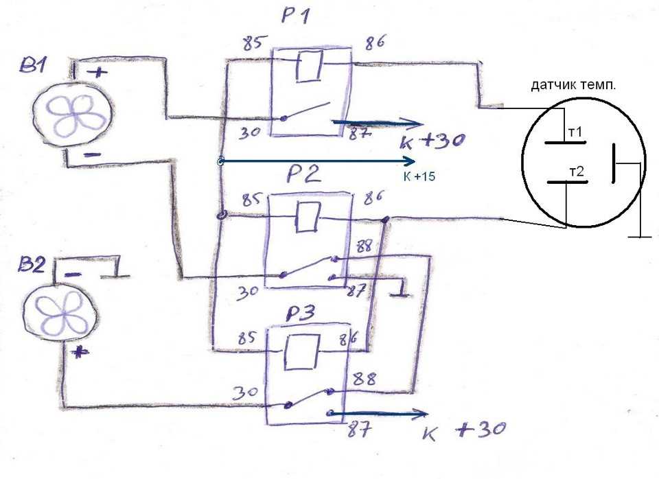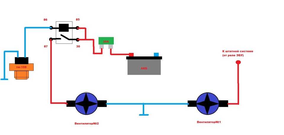 Если температура двигателя достигнет порога срабатывания второго датчика или температуры включения вентиляторов ЭБУ, то питание получат катушки дополнительного реле и реле второго вентилятора. Подвижный контакт дополнительного реле переключит провод от электродвигателя вентилятора на массу автомобиля, в тоже время замкнётся реле второго вентилятора. Это приведёт к переключению вентиляторов в параллельное соединение.
