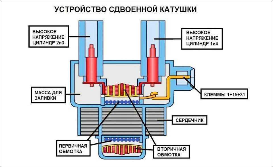 Схема системы зажигания. Чаще устанавливаются на двигателях с электронной системой зажигания. Основной принцип работы такой же как и у стандартных. По конструкции тоже имеет низковольтную и высоковольтную обмотки. Отличием является расположение первичной обмотки внутри вторичной. Соответственно в катушке два сердечника – наружный и внутренний. На высоковольтной обмотке такой катушки имеется установлен специальный диод, отсекающий ток высокого напряжения.