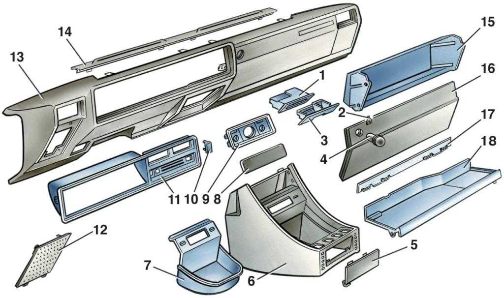 1 — корпус пепельницы; 2 — скоба крепления замка крышки вещевого ящика; 3 — пепельница; 4 — замок крышки вещевого ящика; 5 — вставка декоративная панели крепления радиоприемника; 6 — панель крепления радиоприемника; 7 — вкладыш нижней панели крепления радиоприемника; 8 — облицовка панели крепления радиоприемника; 9 — вкладыш верхней панели крепления радиоприемника; 10 – заглушка табло символа обогрева ветрового стекла; 11 — щиток приборов; 12 — облицовка громкоговорителя;13 — панель приборов; 14 — вставка панели приборов; 15 — корпус вещевого ящика; 16 — крышка вещевого ящика; 17 — звено петли крышки вещевого ящика; 18 — полка панели приборов